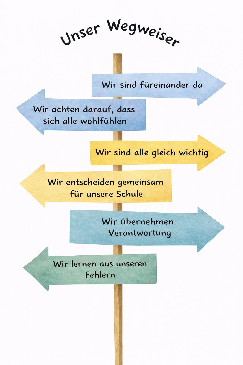 Unser Wegweiser wurde gemeinsam mit den Kindern entwickelt, ebenso lehnt er sich auch an die Beschlüsse an, die bezüglich der Leitlinien der Schule bereits in der Schulkonferenz beschlossen wurden. Er weist uns allen den Weg und bietet uns eine gemeinsame Haltung, nach der wir alle Prozesse und Entscheidungen im Schulaufbau und Schulalltag ausrichten. Denn nur aus einer gemeinsamen, verbindlichen Haltung heraus kann es unserer Ansicht nach gelingen, eine Schule zu gestalten, die alte Muster aufbricht und neu denkt.